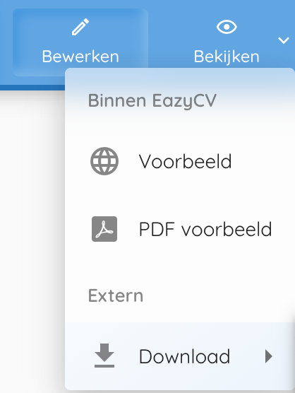 Zodra je cv volledig en correct is bijgewerkt en de preview ziet er netjes is het raadzaam deze eerste goed te keuren. Vervolgens kun je betreffende template downloaden (om bijvoorbeeld aan te bieden bij een opdrachtgever).