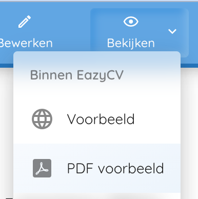 Het is dus handig om tijdens het vullen van het CV regelmatig te switchen tussen “Bekijken” en “Bewerken” om zo het resultaat snel te kunnen beoordelen en waar nodig te schuiven met tekst of andere gegevens.