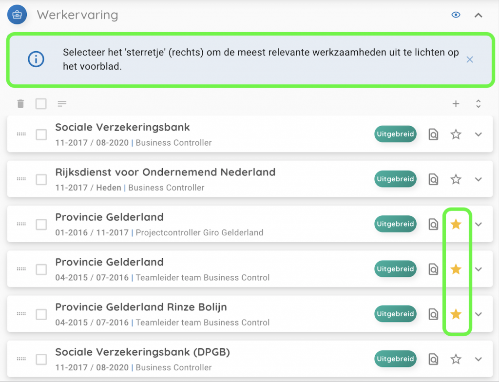 Stel je hebt de afgelopen jaren 10 projecten succesvol uitgevoerd. De rol die je nu hebt of de aanvraag waar jij op wordt aangeboden vraagt om specifieke kennis en ervaring die je bij drie verschillende projecten hebt opgedaan. Deze drie opdrachten zou je dan kunnen uitlichten met behulp van een sterretje.
