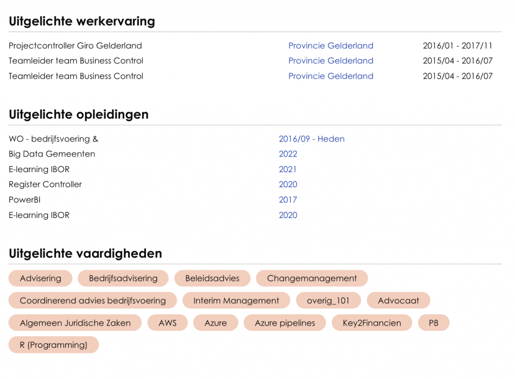 Je CV kan volledig zijn, maar niet alle informatie zal even relevant zijn voor die specifieke functierol of project. Om de highlights uit jouw CV speciaal onder de aandacht te brengen, is het mogelijk om te werken met ‘uitgelichte items’. Houd er rekening mee dat dit wel een specifieke inrichting van het CV-template vraagt.