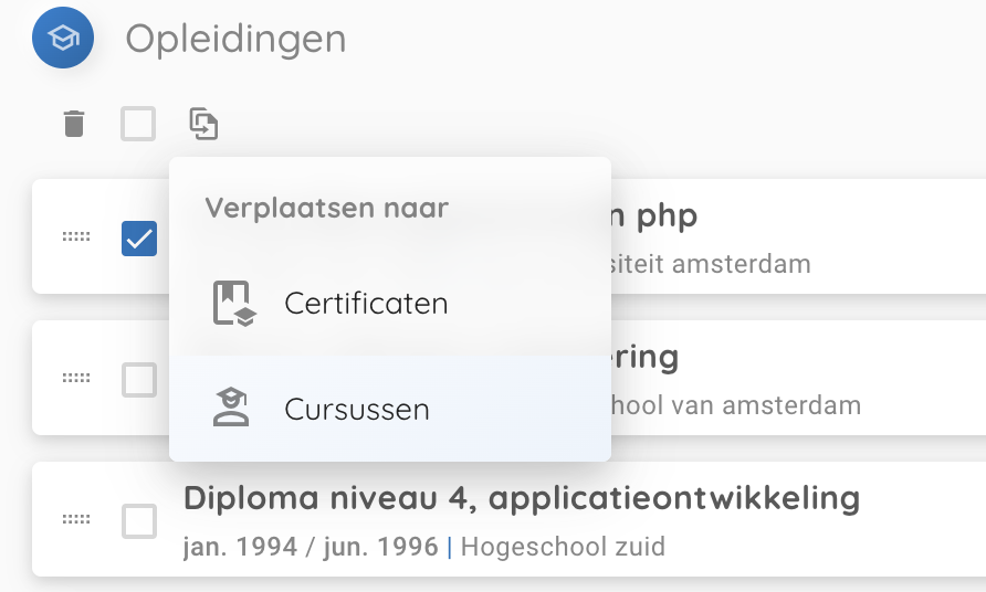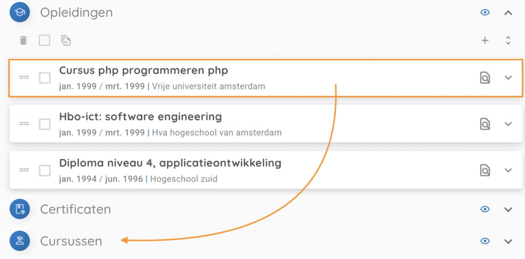 Het komt voor dat items worden herkend en weggeschreven onder een verkeerde cv-sectie. Zo kan het zijn dat het systeem een Cursus als (voltijd) Opleiding herkend. Of een Nevenactiviteit als Werkervaring.