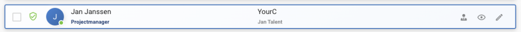 Van links naar rechts ziet u een icoontje van een poppetje. Als u daar op klikt gaat u naar de profielpagina van de professional. Daarnaast ziet u een oogje dat u na een klik zal leiden naar de standaard bekijk modus van uw organisatie (PDF of HTML). Als laatste ziet u een pennetje waarmee u direct naar de pagina om de professional te bewerken gaat.