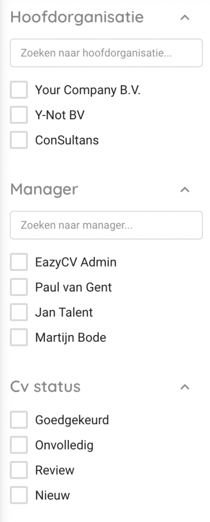 Als laatste is het mogelijk om op de cv-status te filteren. Er zijn 4 verschillende statussen binnen het platform. Door deze te selecteren wordt het mogelijk om op een of meerdere status(sen) te filteren.