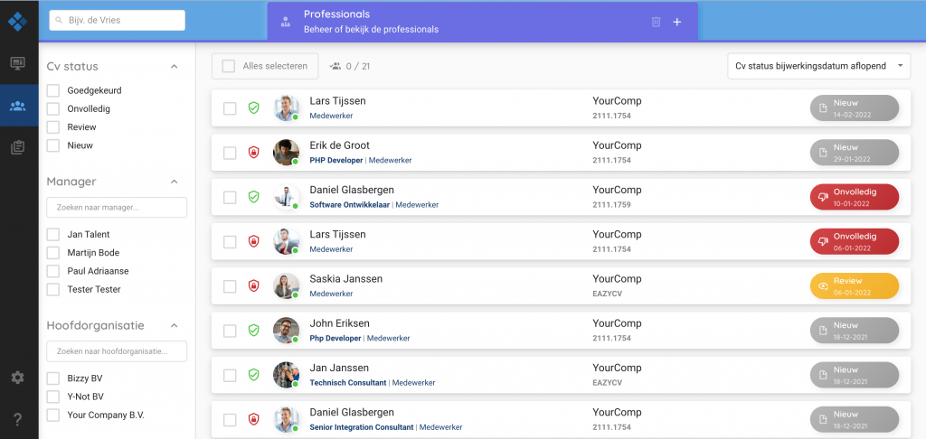 Uitgaande van het feit dat er meer dan een managers zijn aangemaakt is het mogelijk om te filteren op een of meerdere manager(s). Zo krijgt u een duidelijk overzicht van professionals van u of juist die van uw collega manager(s).