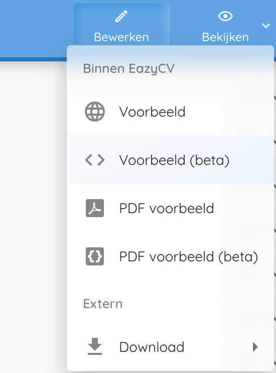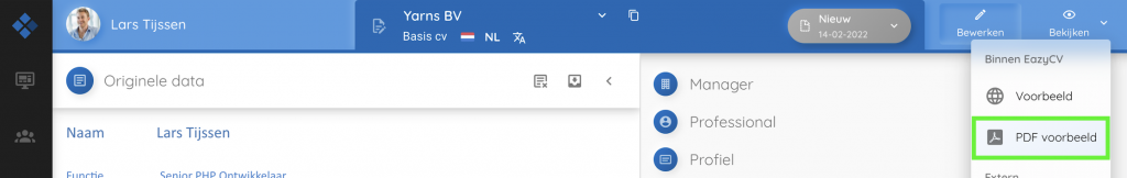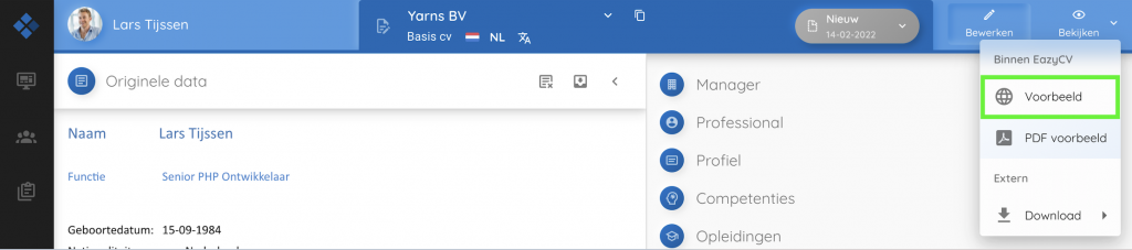 U kunt elk cv van elke professional openen in de beta versie. Zo kunt u zien of de aanpassingen in het cv ook goed werkt voor de professional van uw keuze.